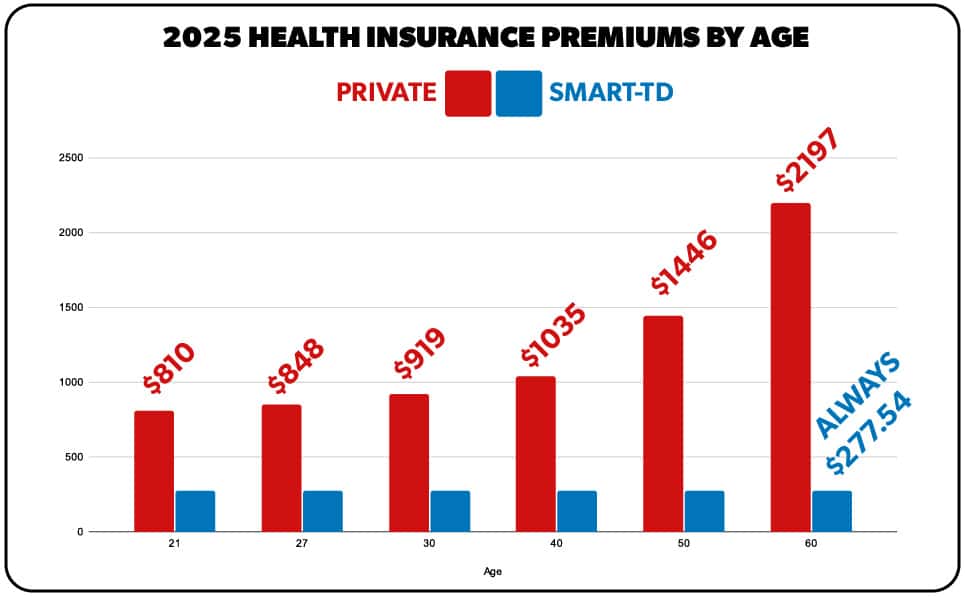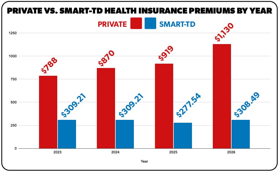By comparison, SMART-TD rail members will pay a flat rate of $308.49 per month in 2026, regardless of their age and regardless of how many dependents are on their plan. Even the youngest workers who benefit from lower private insurance rates will pay nearly 40% more than they would under our healthcare plan.