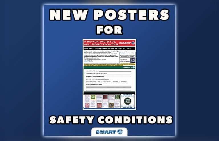 Last summer, SMART-TD’s Empowerment, Education, and Engagement (E-3) Committee began designing and releasing new, eye-catching, durable safety posters for Locals to display prominently in crew rooms, breakrooms, and on-duty locations. These posters make our union visible again. They highlight everything from meeting times and SMART app resources to members’ rights and union benefits.