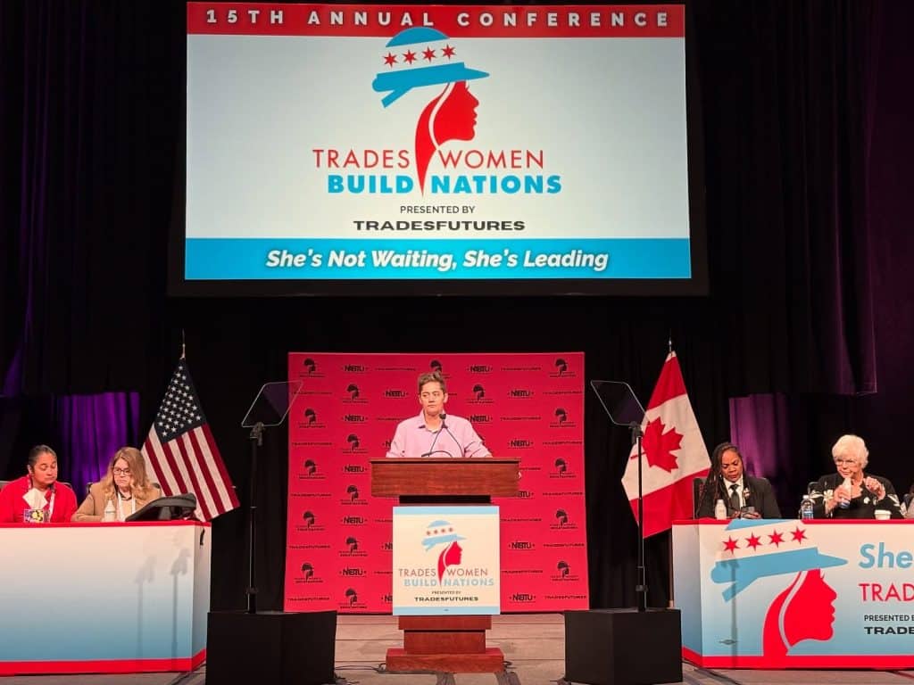 SMART General President Michael Coleman couldn’t attend Tradeswomen Build Nations 2025, but Women’s Committee member Lisa Davis paid tribute to his leadership nonetheless. She acknowledged and praised the progress SMART has made on maternity leave, childcare and the fight for SMART members’ due process under his presidency.