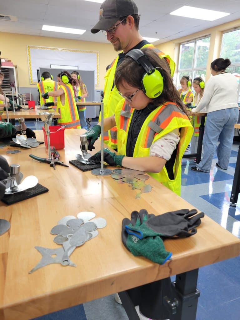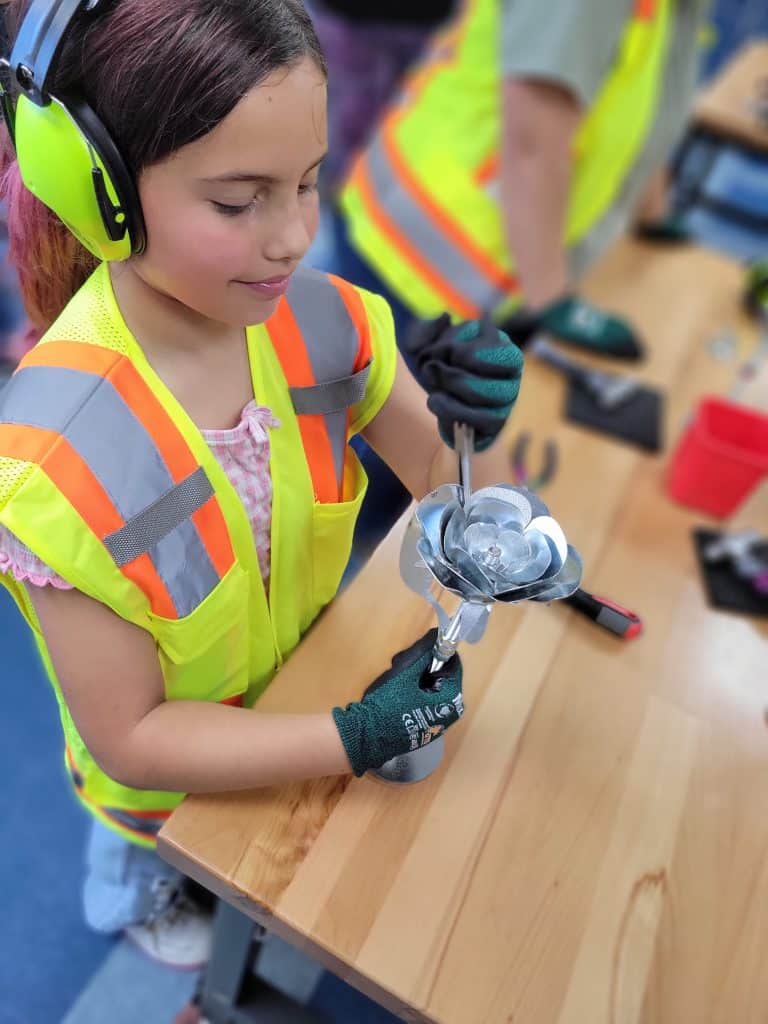 “During each class, we share a bit about who we are and what we do as a union,” Hobbs said, “explaining the work behind heating and air systems, roofing, siding and more. The kids then get hands-on experience making metal roses, with stems made from 3/8-inch all-thread, and petals and leaves cut from 24-gauge galvanized steel. They texture and shape the metal with ball-peen hammers, assemble their roses using nuts and washers, and add more depth by bending the petals with pliers to the shape they like.”
