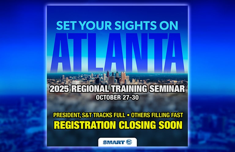 The Atlanta RTS begins on Monday, October 27, 2025, with an evening Welcome Reception. The training will cover topics such as local governance, the roles and responsibilities of local presidents, secretaries, treasurers, legislative representatives, and local chairpersons in member advocacy, an overview of the SMART Constitution, and other key subjects.