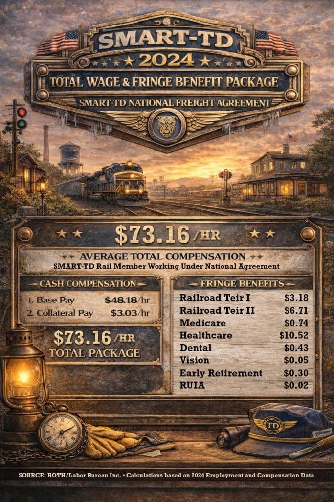 The $73.16 per hour figure for SMART-TD members under the National Freight Agreement in 2024 is a total compensation number, not just straight-time wages. It includes actual hours worked, paid time off, and the real cost of employer-paid benefits including what the railroad pays into Tier I and Tier II — all rolled into a per-hour-worked figure.